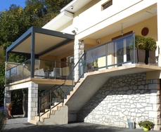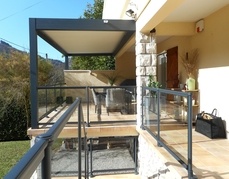 PERGOLA BIOCLIMATIQUE avec BRISE SOLEIL A LAMES ORIENTABLES MOTORISE - structure pergola en alu coloris Gris (RAL 7016) sablé - équipé de lames alu plates avec joint d'étanchéité - équipé de capteur vent + capteur pluie + capteur température + poutre chéneau avec récupérateur d'eau intégré.