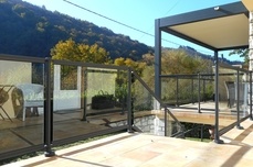 GARDE CORPS - alu composé d'une main courante diamètre 45mm avec articulation orientable de 90° à 270° et embouts de finition. Habillage fixé entre poteaux, composé de verre feuilleté 44.2 clair de 8.76mm monté entre 2 lisses de 47x35mm. Poteaux de diamètre 40mm avec sabots de fixation à réglage tridimensionnel pour pose à plat ou en latéral. Coloris Gris 7016 sablé