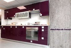 Ilot central du modèle : laque brillante - coloris Gris Zibeline - façades épaisseur 19 mm - fonds de meubles épaisseur 8 mm - champs laqués - plinthes stratifiées décor Alu - Plan de travail de 40 mm d'épaisseur décor Acier.