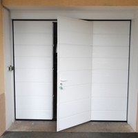 Porte sectionnelle (refoulement par le haut) équipé d'un portillon piéton et vitrages pour créer des entrées de lumière dans le garage.